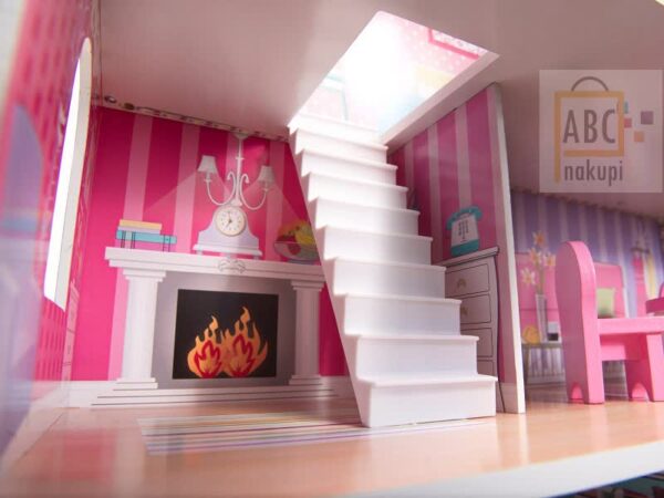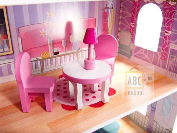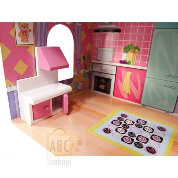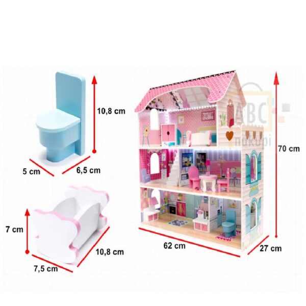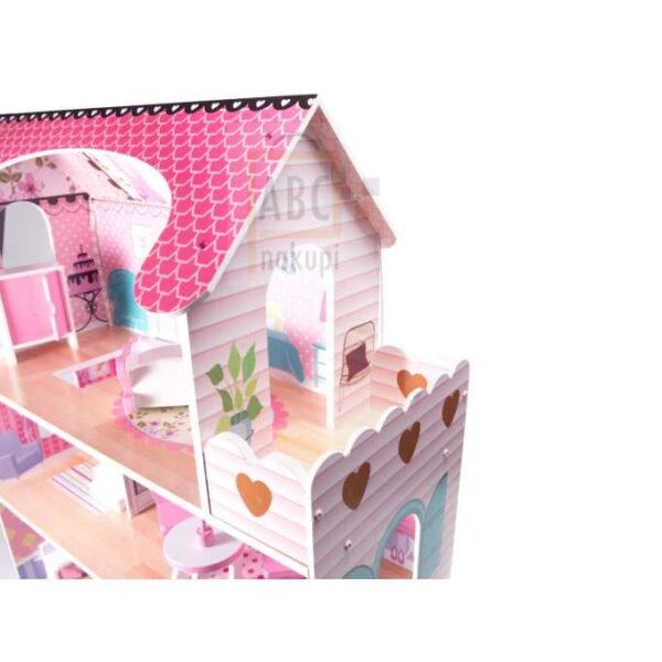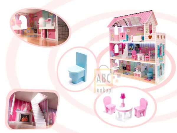 Večina otrok sanja o svoji vili za igrače. Ta razkošna 3 nadstropna vila s čudovitim lesenim pohištvom bo otroka res očarala, ter nudila zabavo celi družini. Hiša ima vso potrebno opremo da se igra lahko začne takoj. Prostorne sobe bodo sprejemale tudi goste, ki jih pripeljejo prijatelji vašega otroka. Vila ima 3 nadstropja in je opremljena s 5 sobami in teraso, ki jih sestavljajo kuhinja, kopalnico, spalnico, dnevno sobo, stopnišče. Med pohištvom boste našli garderobno omaro, kateri se odpirajo vrata. Prav tako so v kompletu še: lesena postelja z mehko vzmetnico in lesena svetilka, 2 udobna visoka stola, zibelka, okrogla miza, štedilnik, omara z umivalnikom in wc.