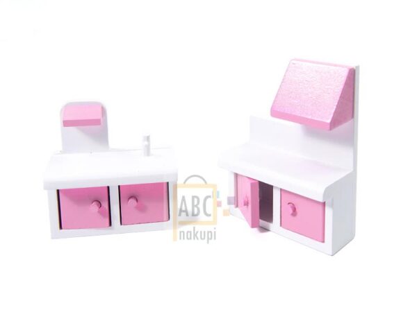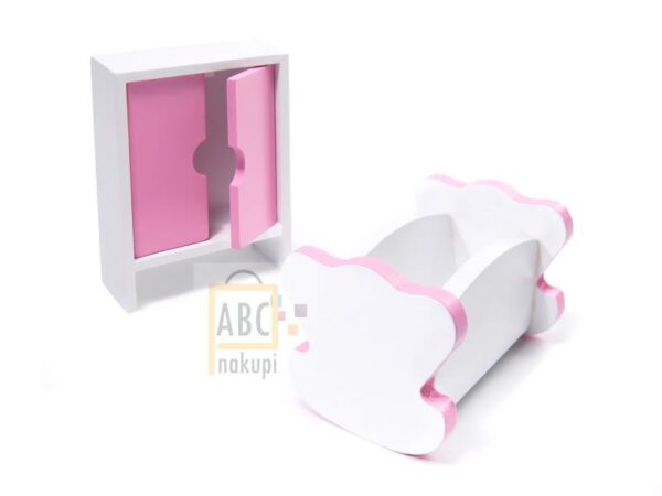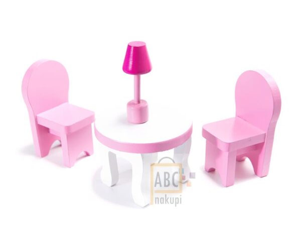 -Vsebina kompleta: elementi za sestavo koče, kovinski vijači, pohištvo (ležišče z vzmetnico, 2x visoki stoli, okrogla miza; svetilka; zibelka; omarica z odprtimi vrati; omarica, omara s umivalnikom; straniščem)