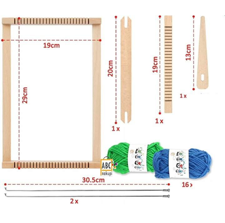 -Set vsebuje:statve, kovinske napere, lesen kvačkalni kvačkač, lesena tkalna igla, leseni tkalni glavnik, klobčkov preje (naključne barve)