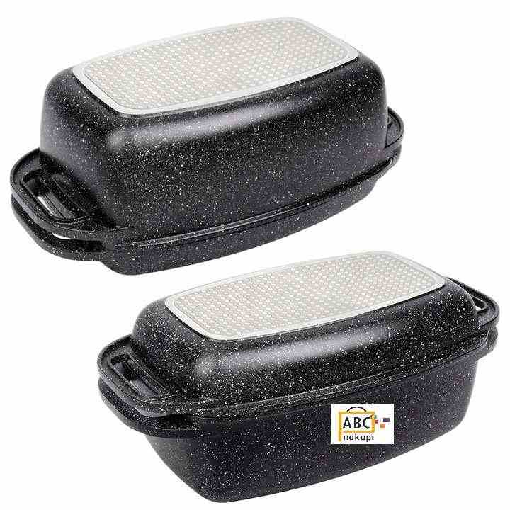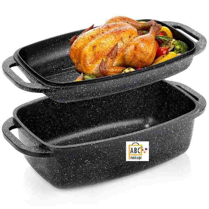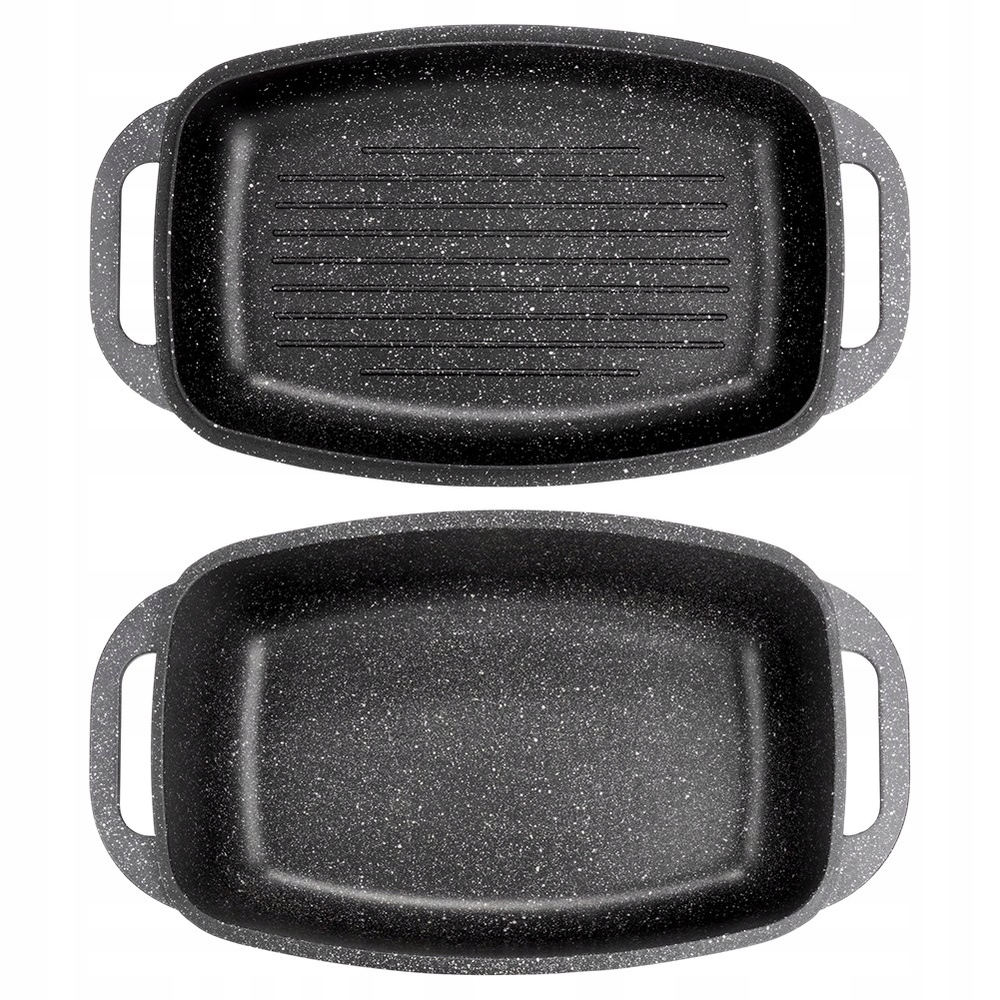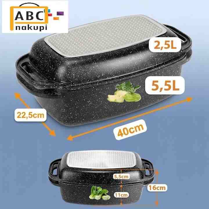 Granitni pekač 2/1- 5,5l s pokrovom je odličen kuhinjski pripomoček, ki vam bo olajšal pripravo okusnih jedi. Pekač je izdelan iz litega aluminija z nelepljivim granitnim premazom, kar omogoča pripravo hrane z minimalno količino maščobe. Zgornji kot spodnji del pekača sta opremljena z udobnimi ročaji, ki olajšajo prenašanje. Pokrov se lahko uporablja kot samostojna jed, ima žlebasto površino, ki omogoča pripravo jedi z značilnim učinkom žara in odtekanje odvečne maščobe. Pekač je odporen na temperature do 250°C.