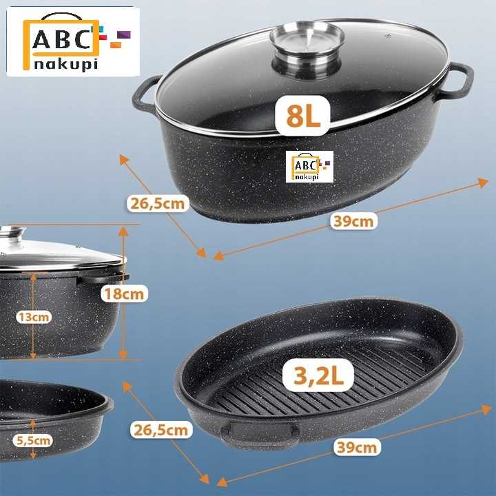 Granitni pekač 3/1 s steklenim pokrovom je odličen kuhinjski pripomoček, ki vam bo olajšal pripravo okusnih jedi. Pekač je izdelan iz litega aluminija z nelepljivim granitnim premazom, kar omogoča pripravo hrane z minimalno količino maščobe. Pekač in pekač za žar sta iz aluminija z nelepljivo granitno prevleko, kar omogoča pripravo hrane z minimalno količino maščobe. Popolnoma nabira toploto, kar vam omogoča, da ohranjate temperaturo hrane dlje časa. Stekleni pokrov je odporen na toploto.
