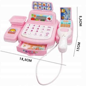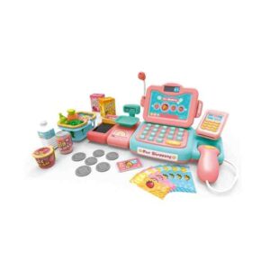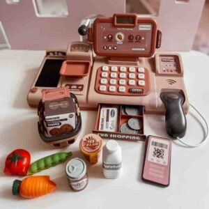 Ta otroška blagajna razvija otroško domišljijo in spodbuja ustvarjalno razmišljanje. Otroci lahko stehtajo sadje in zelenjavo ter ju nato s tipkovnico naložijo na blagajno. Z optičnim bralnikom lahko otroci skenirajo paket piškotov ali steklenico vode. Nato lahko plačajo na dva načina: tradicionalno z gotovino ali s plačilno kartico. Vse to je vključeno v komplet in bo otrokom zagotovilo ure zabave.